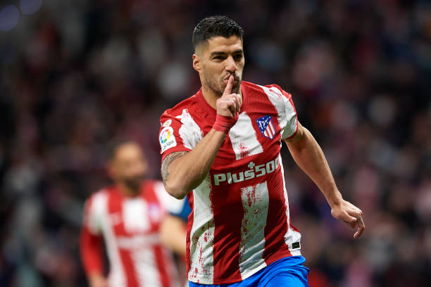 Luis Suarez dari Atletico Madrid merayakan setelah mencetak gol pertama timnya. Pertandingan La Liga Santander antara Club Atletico de Madrid dan Deportivo Alaves di Estadio Wanda Metropolitano pada 2 April 2022 di Madrid, Spanyol. (Foto oleh Jose Breton/Pics Action/NurPhoto via Getty Images)